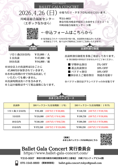 大人のバレエコンクール、大人のバレエプレコンクールのサイトです。 バレエ・ダンス用品のマーティ主催。東京で開催。大人バレエのレベルや年齢別によって様々な賞や副賞あり。入門者から経験者、初心者向けやバレエシューズ部門、パドドゥ部門も開催。ミセス、シニアも参加者多数。This is Japan Otona-Ballet-Competition / Concours Home Page。コンクールのスケジュールや費用をお知らせします。大人バレエの講師や海外・国内のバレエ団で活躍された経験豊富な審査員。予選や決戦の結果を速報します。初心者から入賞常連者まで、日本全国から様々なレベルの参加者・指導者が多く集まる。入賞者は賞金や公演鑑賞のチケット、大人のバレエ留学など。受賞目指して、多くの参加者・大人バレエ・オープンクラス、フリーのダンサーを募集しています。